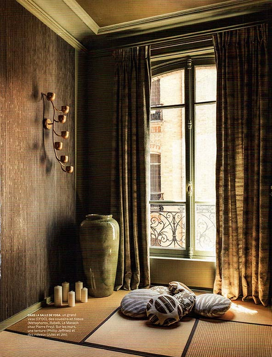 In the article" Un ecrin precieux" interior designer Anne-Sophie featured Parthenon 6303 Mink Metope in the yoga room of a clients home.