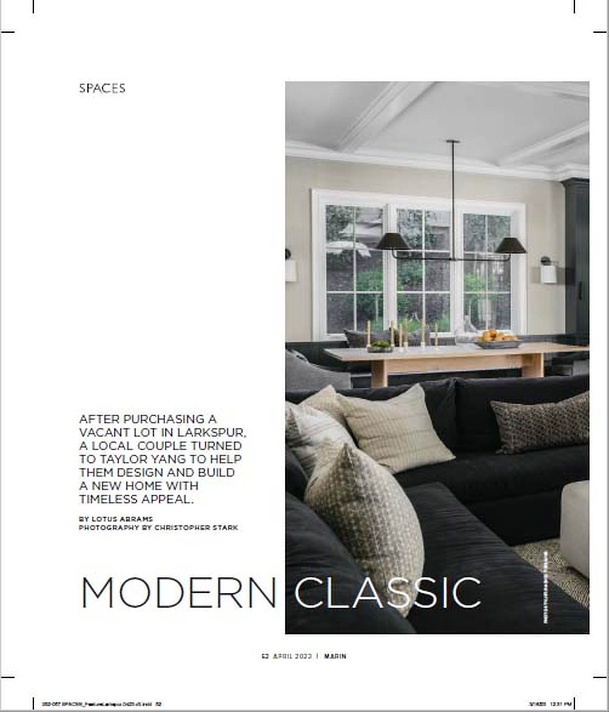 In article, "Modern Classic," interior design firm Taylor Yang features Bermuda Hemp 5528 Dew Drops in the family room of a client's timeless Larkspur home.