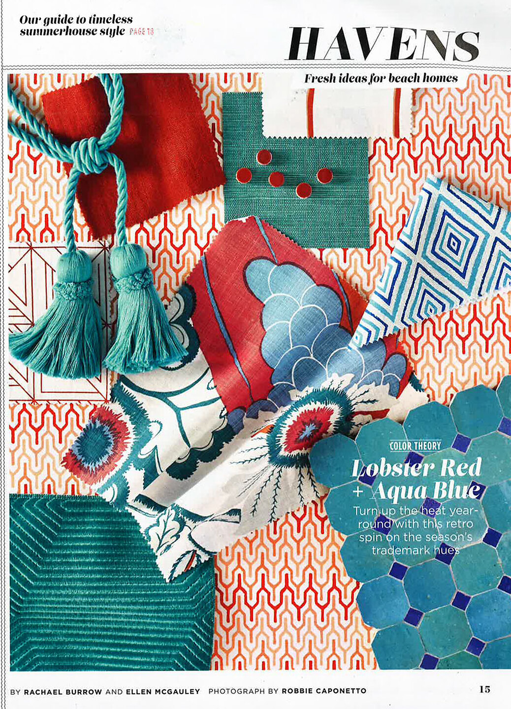 In article, "Havens," Manila Hemp 5276 Turquoise is featured as a new idea for beach homes.